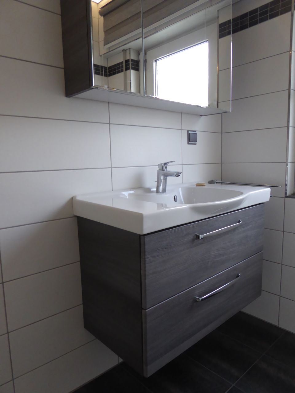 Das kompakte Tageslichtbad wurde erst vor wenigen Jahren komplett mit allen Leitungen erneuert und verfügt jetzt über eine nahezu bodengleiche Dusche und großem Handtuchtrockner.